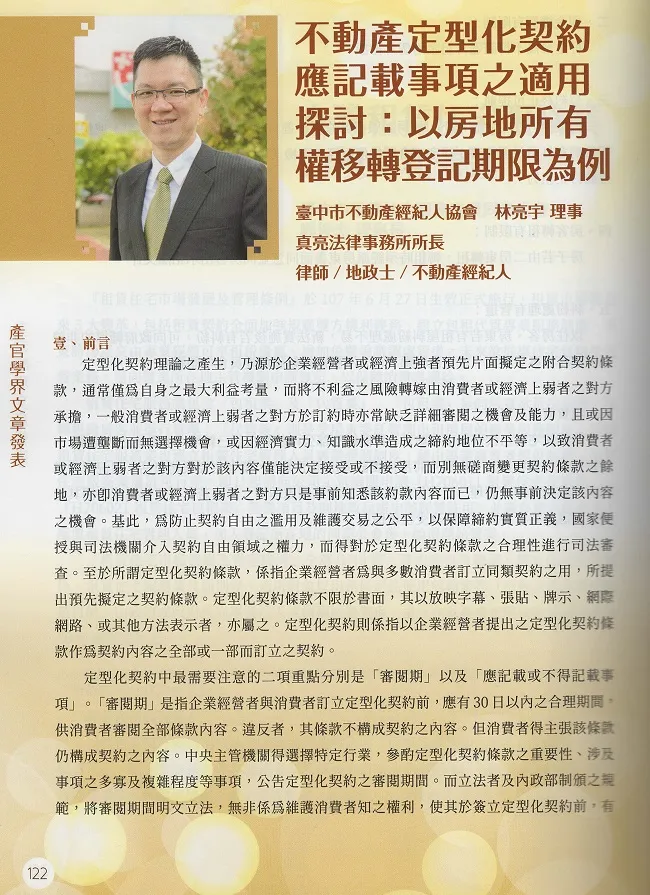 真亮法律事務所所長林亮宇律師亦為臺中市不動產經紀人協會理事,於108年1月17日參加【2019大臺中不動產高峰論壇】,並受邀刊載「不動產定型化契約應記載事項之適用探討:以房地所有權移轉登記期限為例」一文於本次特刊中。