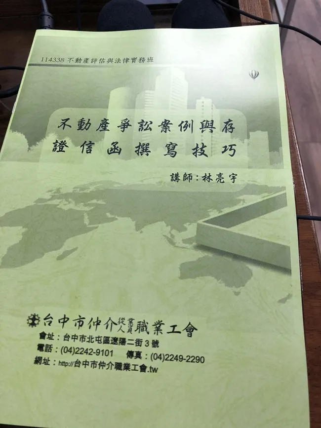 真亮法律事務所林亮宇律師,於107年9月15日受社團法人臺中市不動產仲介培訓協會之邀,至「不動產民法訓練實務班」主講:「民法物權」系列課程。