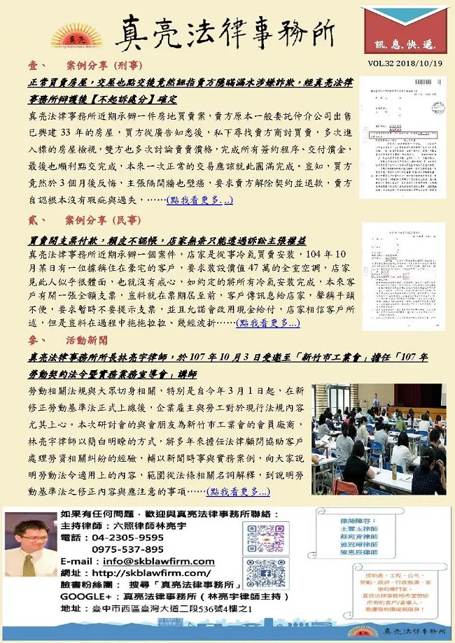 真亮法律事務所近期承辦一件房地買賣案,賣方原本一般委託仲介公司出售已興建33年的房屋,買方從廣告知悉後,私下尋找賣方商討買賣,多次進入標的房屋檢視,雙方也多次討論賣賣價格,完成所有簽約程序、交付價金,最後也順利點交完成,本來一次正常的交易應該就此圓滿完成。豈知,買方竟然於3個月後反悔,主張隔間牆也壁癌,要求賣方解除契約並退款,賣方自認根本沒有瑕疵與過失,……(點我看更多. ..)